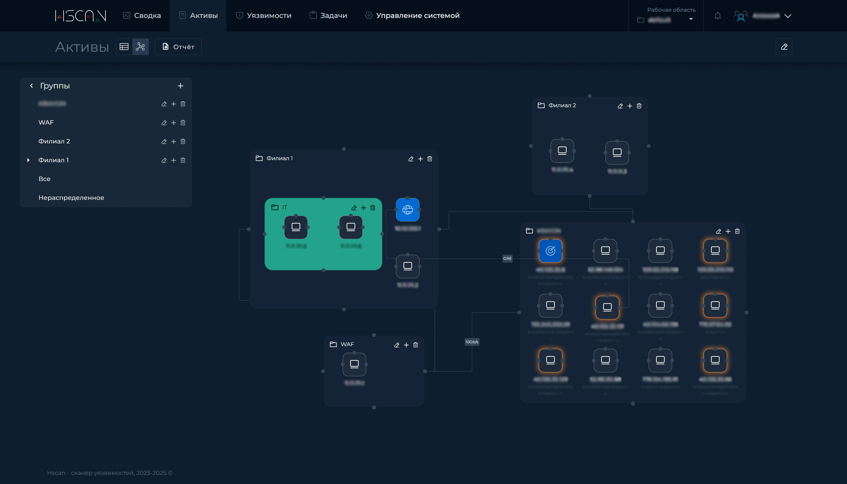 HScan не ограничивается плоским списком активов: система позволяет выстроить топологию активов – граф связей между узлами. Визуальная карта позволяет сегментировать активы по рабочим зонам, подсетям и пользовательским группам – как удобно. Это дает не только визуальное представление карты уязвимых хостов, но и понимание, какие соседние сервисы и критичные ресурсы доступны напрямую или через короткие цепочки связей на случай, если актив окажется скомпрометированным. Карточка любого узла на карте дает быстрый переход к списку его уязвимостей и истории сканирований, а из карты можно формировать целевые задачи на различные типы сканирования.
