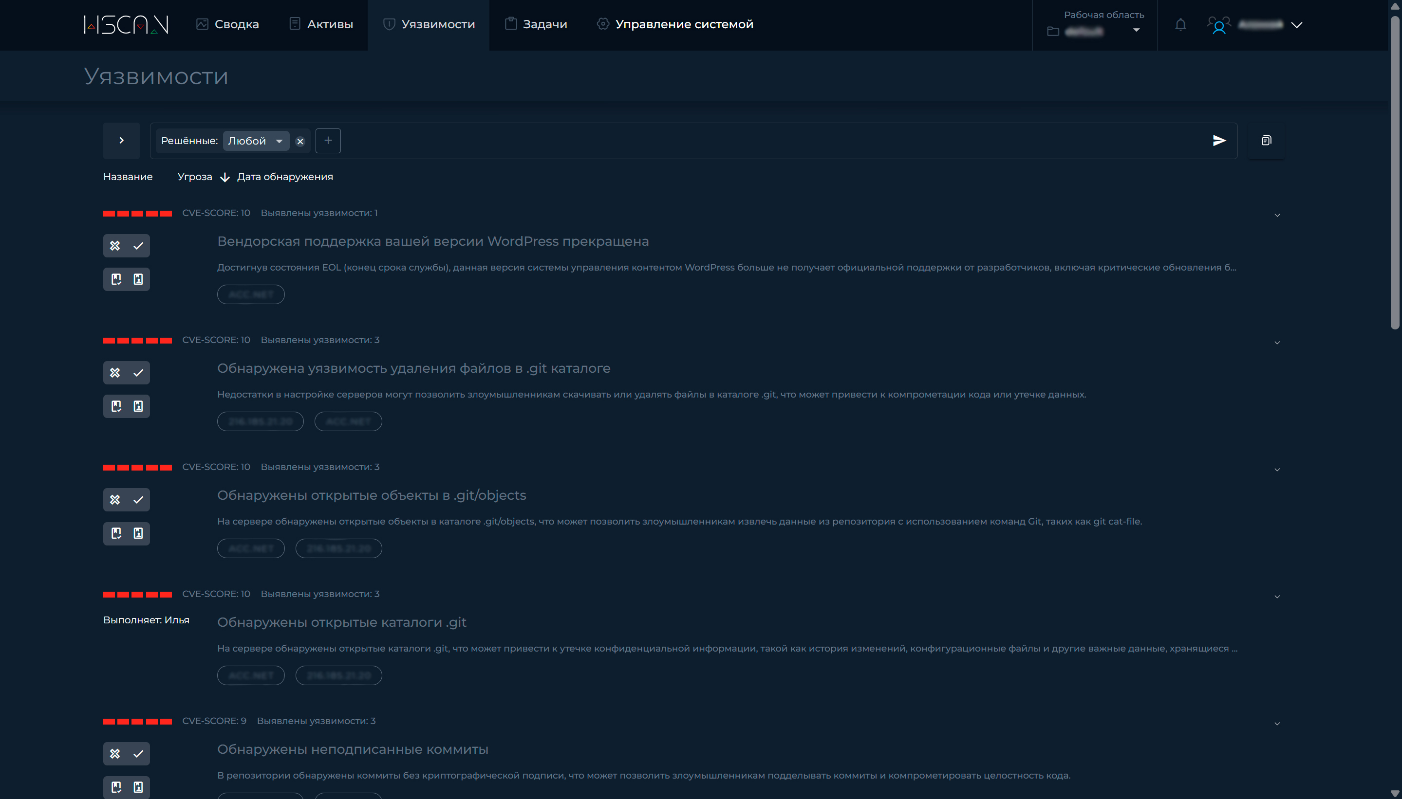 Система управления уязвимостями в HScan отображает все выявленные уязвимости и потенциально небезопасные мисконфигурации с детализацией по уровням критичности (включая диапазон CVSS), вероятности эксплуатации (если доступна информация об эксплойтах), дате первого обнаружения и текущему статусу обработки. Интерфейс предусматривает гибкую фильтрацию: по уровню угрозы, по времени обнаружения, по типу или названию программного обеспечения, по группе активов или рабочей зоне. То есть можно быстро сформировать выборки – например, только критичные и неустраненные уязвимости, найденные за последнюю неделю, или только те, что затрагивают конкретное приложение. Для каждой записи доступны описание, технические параметры, ссылки на источники и возможность назначения задачи на устранение. Отчеты можно выгрузить в HTML или CSV.