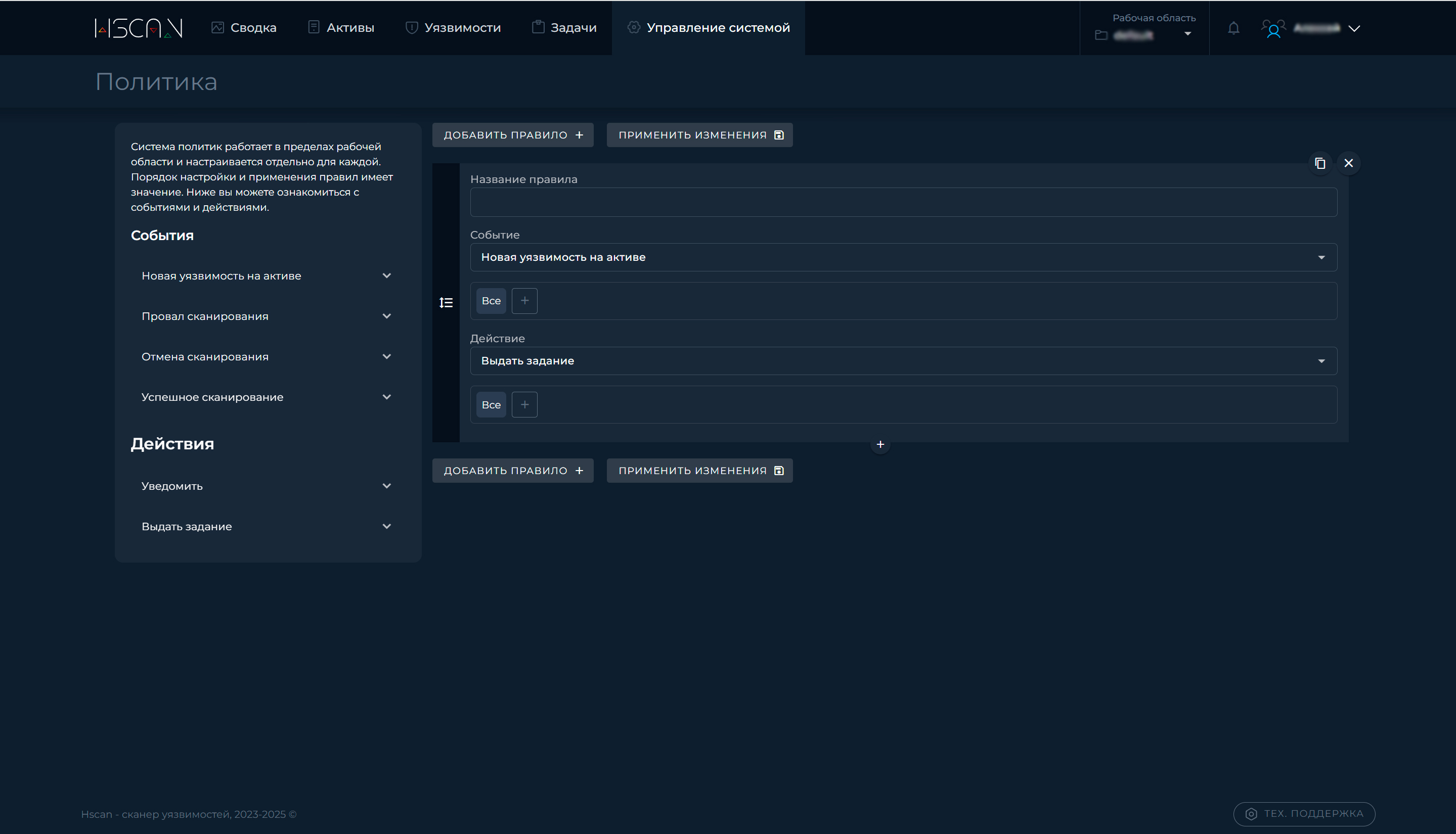 В HScan реализована система автоматизации действий на основе заданных политик. Политики настраиваются отдельно для каждой рабочей области и позволяют запускать заранее определенные реакции на конкретные события в системе. Порядок применения правил имеет значение: они обрабатываются по очереди сверху вниз.